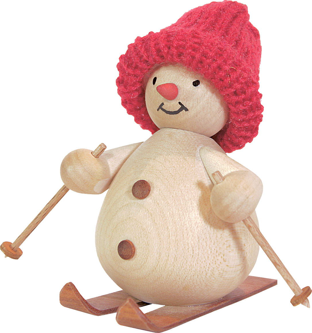 Der Schneemann hat gute Laune. Endlich kann er mit seinen Skiern durch den Wald fahren.