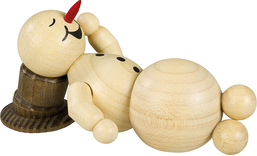 Der Schneemann ist erschöpft. Er hat sich hingelegt und benutzt den Zylinder als Kopfkissen. Seine Augen hat er geschlossen.