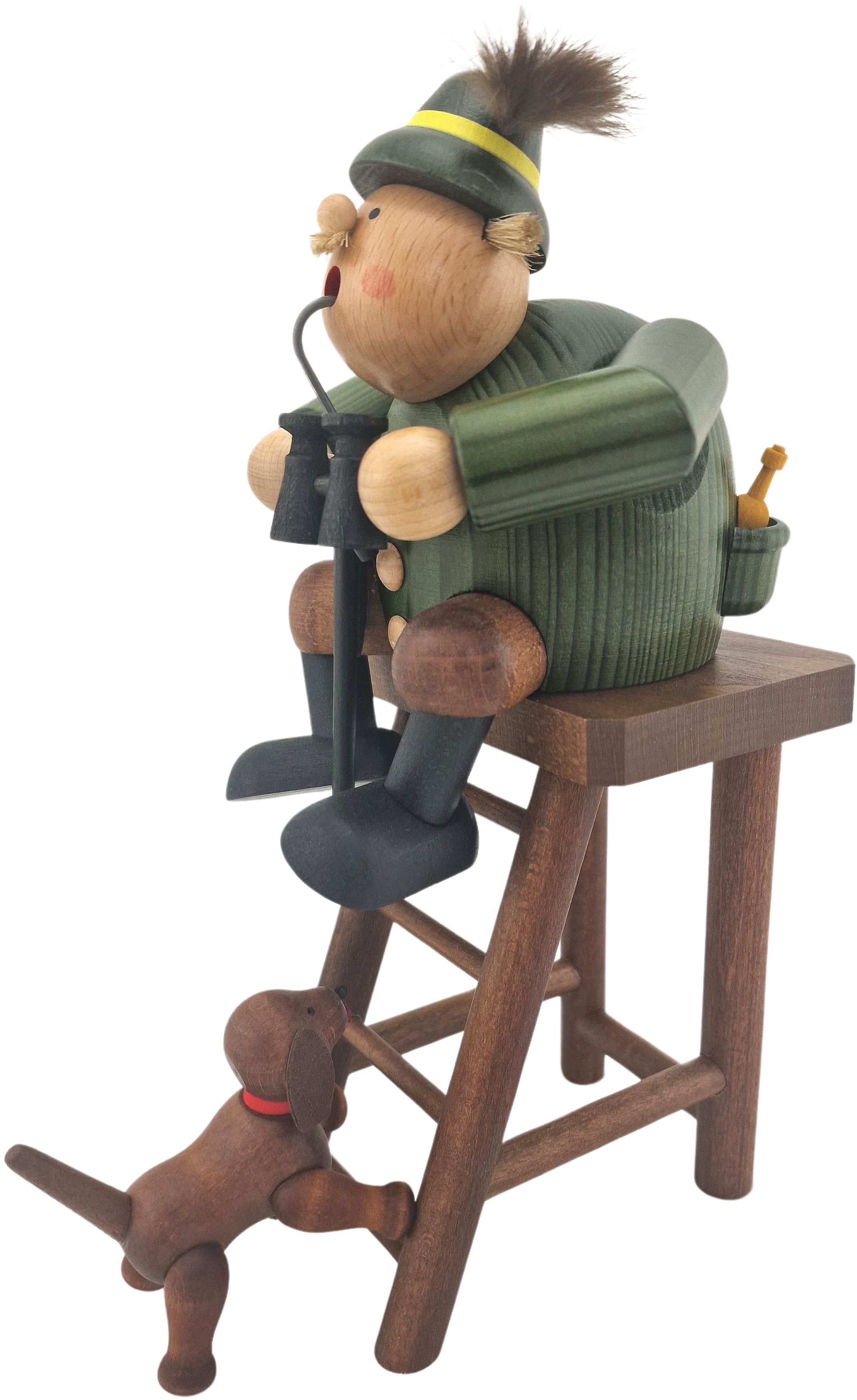 Der Jäger hat es sich auf seinem Hochsitz mit Fernglas und Gewehr bequem gemacht. Sein Hund schaut von untern herauf.