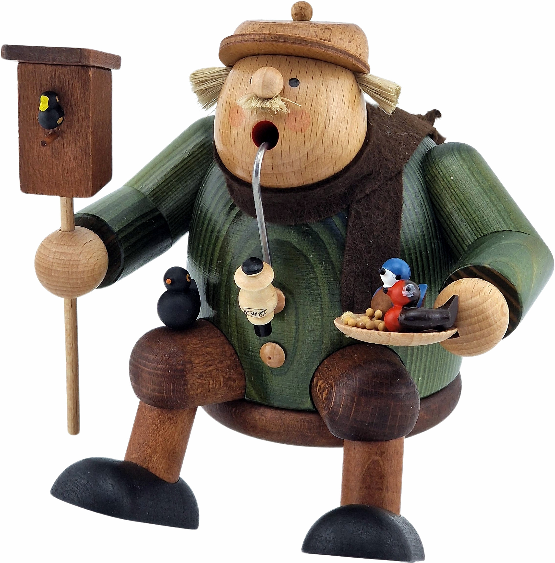Der Vogelfreund hält in seiner Hand einen Nistkasten, welcher sich auf einer Stange befindet. Ein Vogel schaut gerade heraus. In der anderen Hand kann man eine Futterschale sehen. Zwei Vögel haben sich hier niedergelassen. Auf seinem Bein hat sich ein weiter Vogel gesetzt.