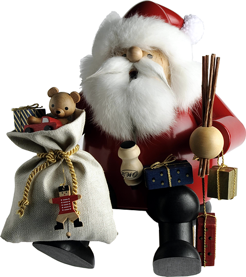 Der Weihnachtsmann macht eine kurze Rast. Dabei raucht er gemütlich seine Pfeife. In einer Hand hält er seinen Geschenkesack und in der anderen seine Rute. Im Sack kann man verschiedene Geschenke sehen. Weitere Geschenkepäckchen hängen über seinem Handgelenk.