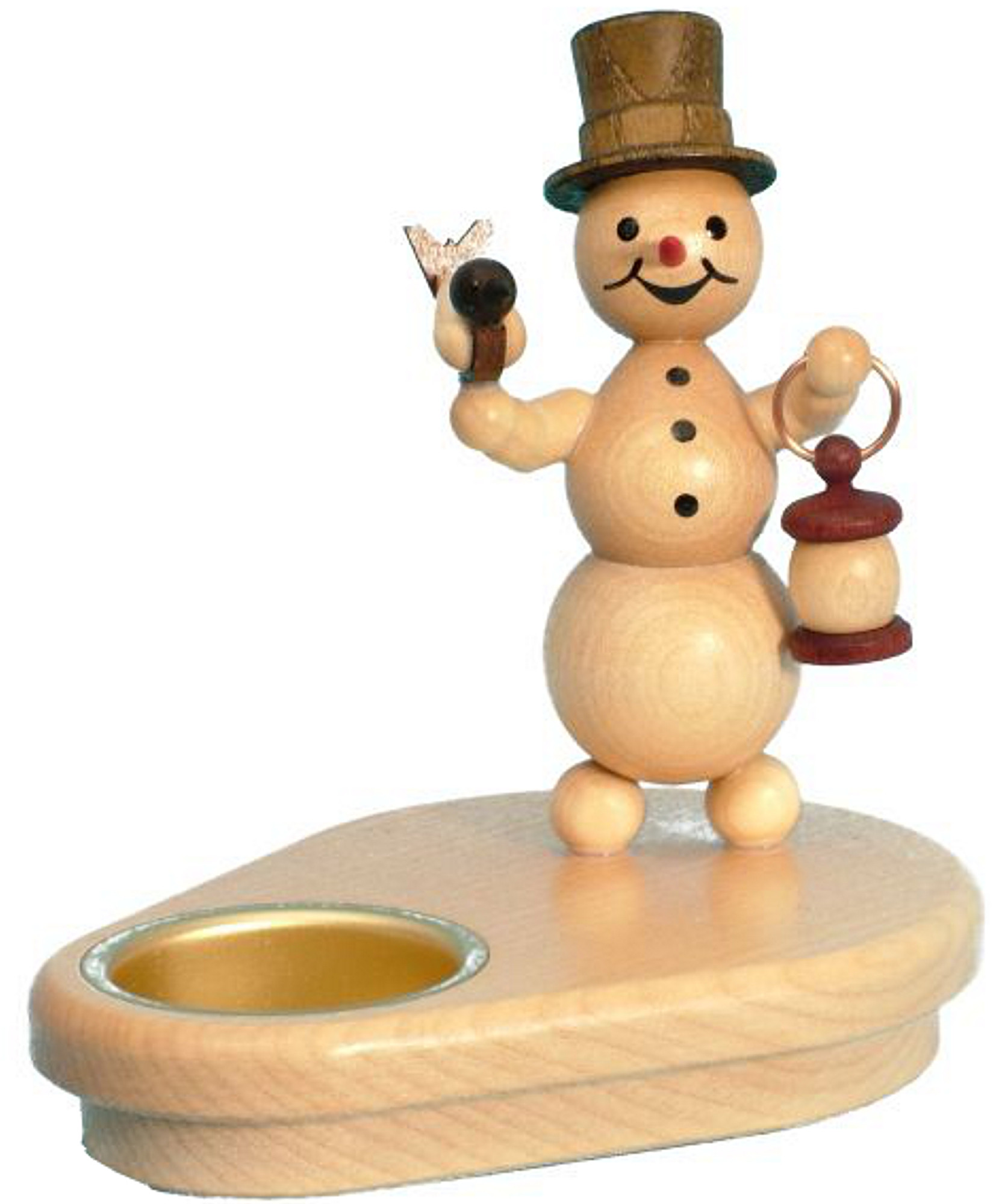 Schneemannleuchte für ein Teelicht. Der Schneemann trägt einen Zylinder auf seinem Kopf. In einer Hand hält er die Laterne und auf der anderen sitzt ein kleines Vögelchen.