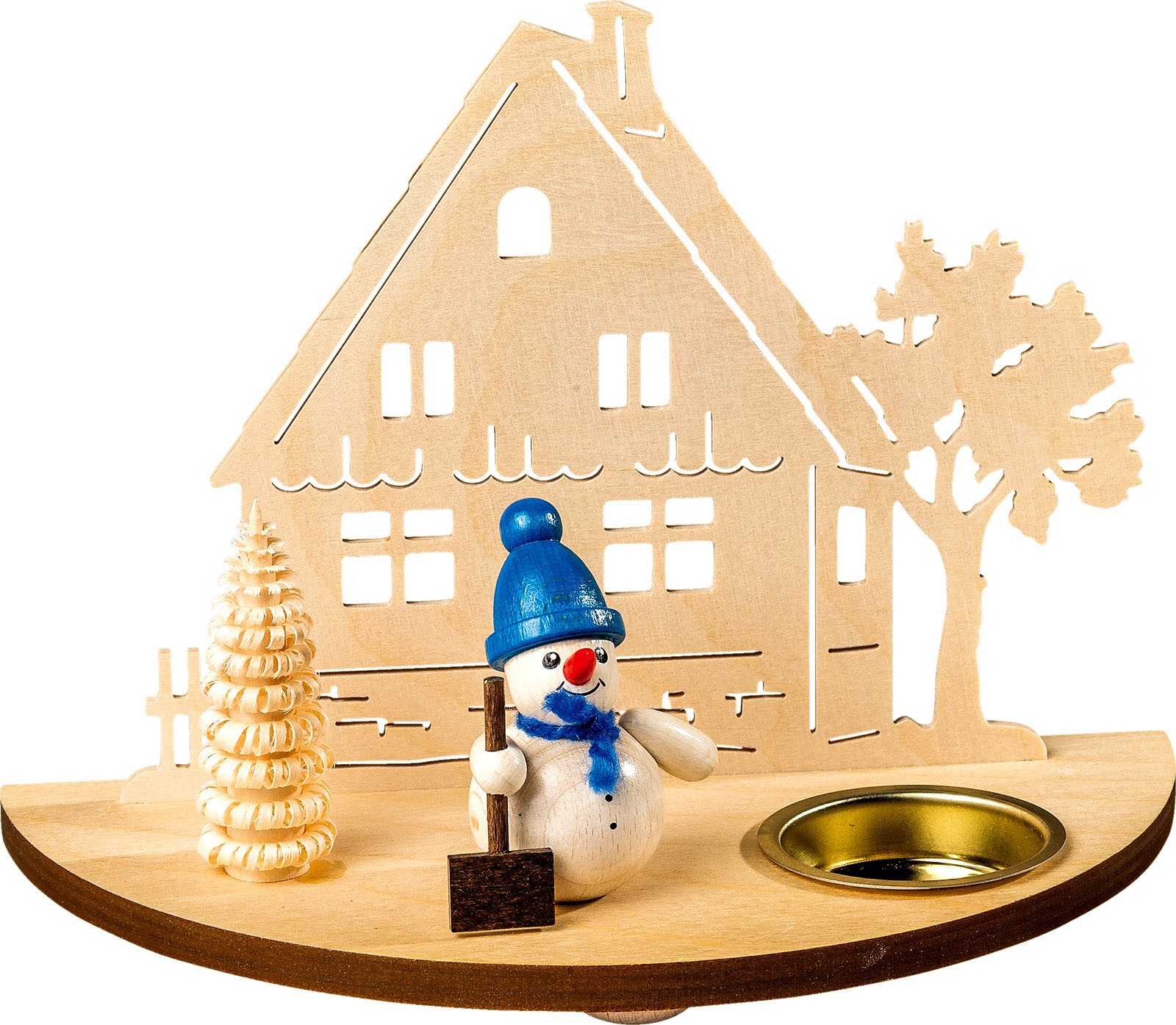 Im Hintergrund steht ein Haus mit einem Baum. Davor befindet sich ein Schneemann mit einer Schaufel. Die Mütze und der Schal sind blau. Es ist auch noch ein Spanbaum zu sehen.
