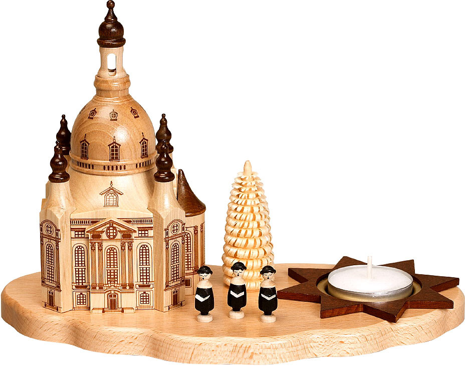 Neben der Dresdner Frauenkirche ist eine Gruppe Kurrendesänger zu sehen. Diese halte in ihren Händen Gesangsbücher. Hinter ihnen steht eine kleines Bäumchen. Die Teelichttülle ist von einem dunklen Stern umgeben.