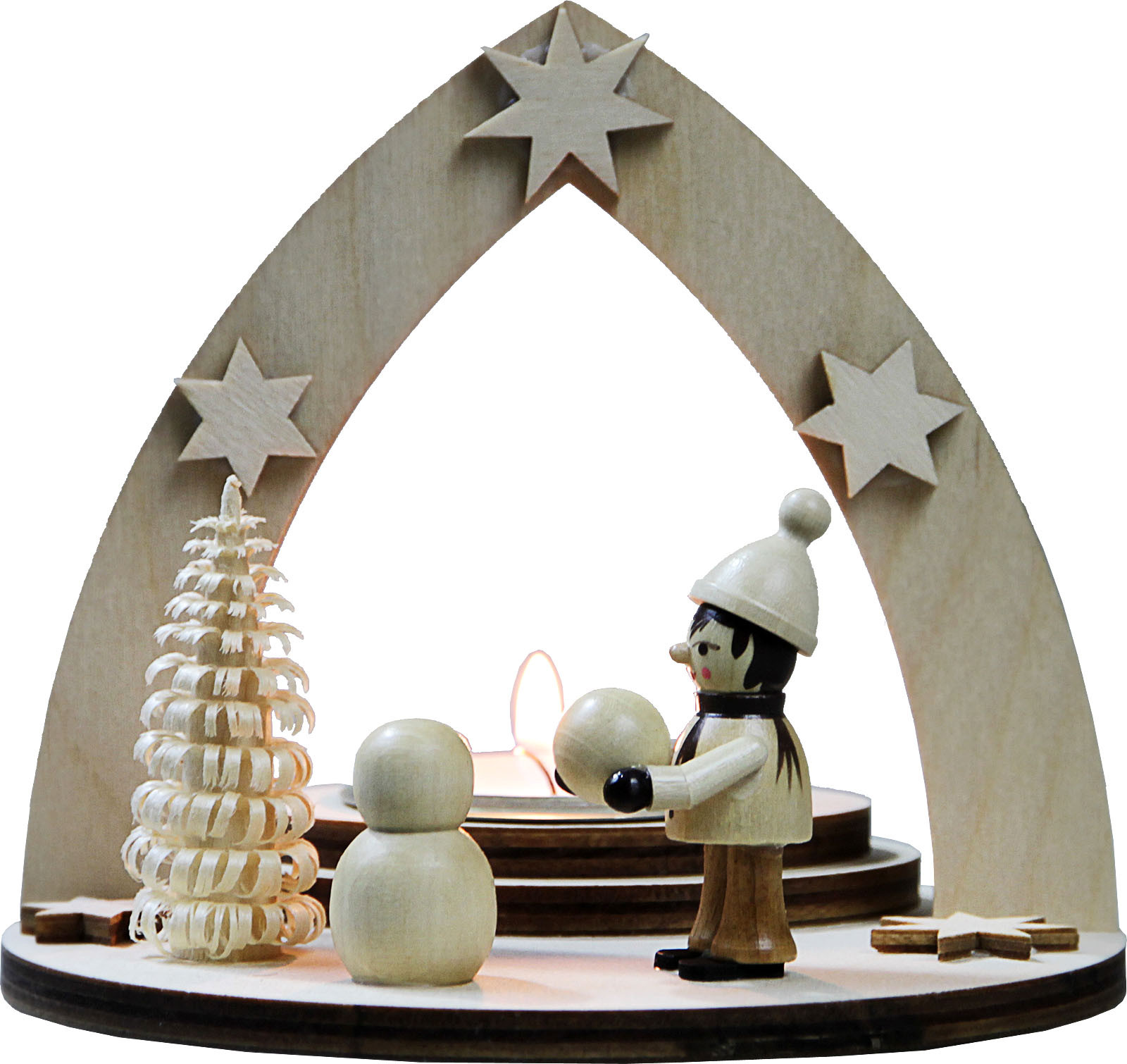 Ein Junge befindet sich vor einem Podest, in dessen Mitte sich das Teelicht befindet. In seiner Hand hält er eine große Schneekugel. Diese will er auf die anderen beiden setzen, damit ein Schneemann entsteht. Auf dem Sockel und am Bogen sind kleine Sterne befestigt.