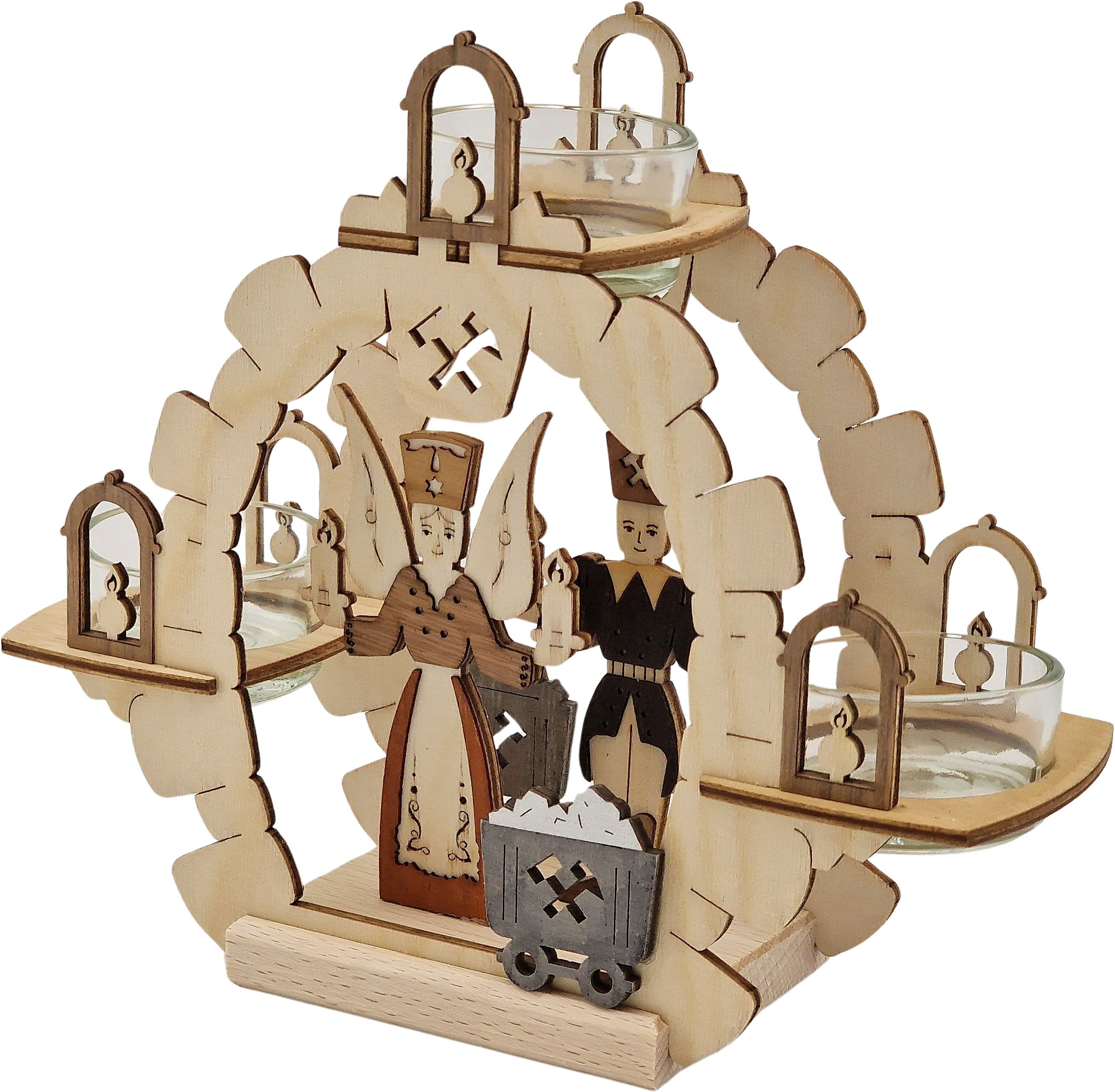 Der Teelichtkranz hat die Form eines Bergwerkstollens. Im Eingang steht ein Bergmann mit zwei Lichtern in den Händen. Hinter ihm kann man einen Engel erkennen. Auch er hält zwei Lichter in den Händen. Vor den beiden steht eine Lore, gefüllt mit Erz. Eine weiter Lore sieht man hinter den beiden stehen. Diese ist schwarz und mit Kohle gefüllt. Über Engel und Bergmann sind die gekreuzten Eisen und Schlegel erkennbar.