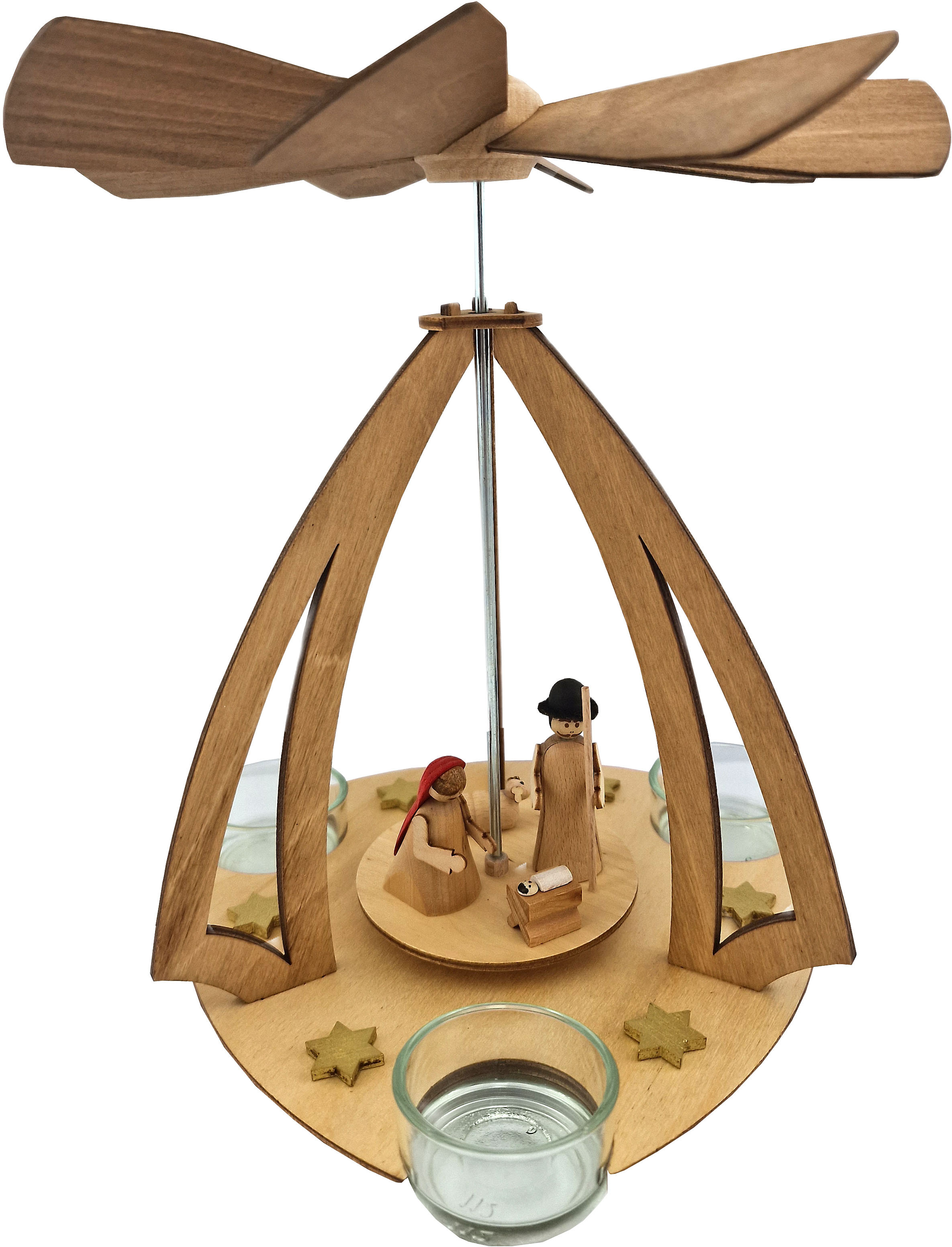 Maria sitzt auf dem Drehteller neben der Krippe mit ihren neugeborenen Sohn. Auf der anderen Seite der Krippe steht Josef. Hinter ihm befindet sich ein Schaf. Goldene Sterne verzieren den Boden der Pyramide.