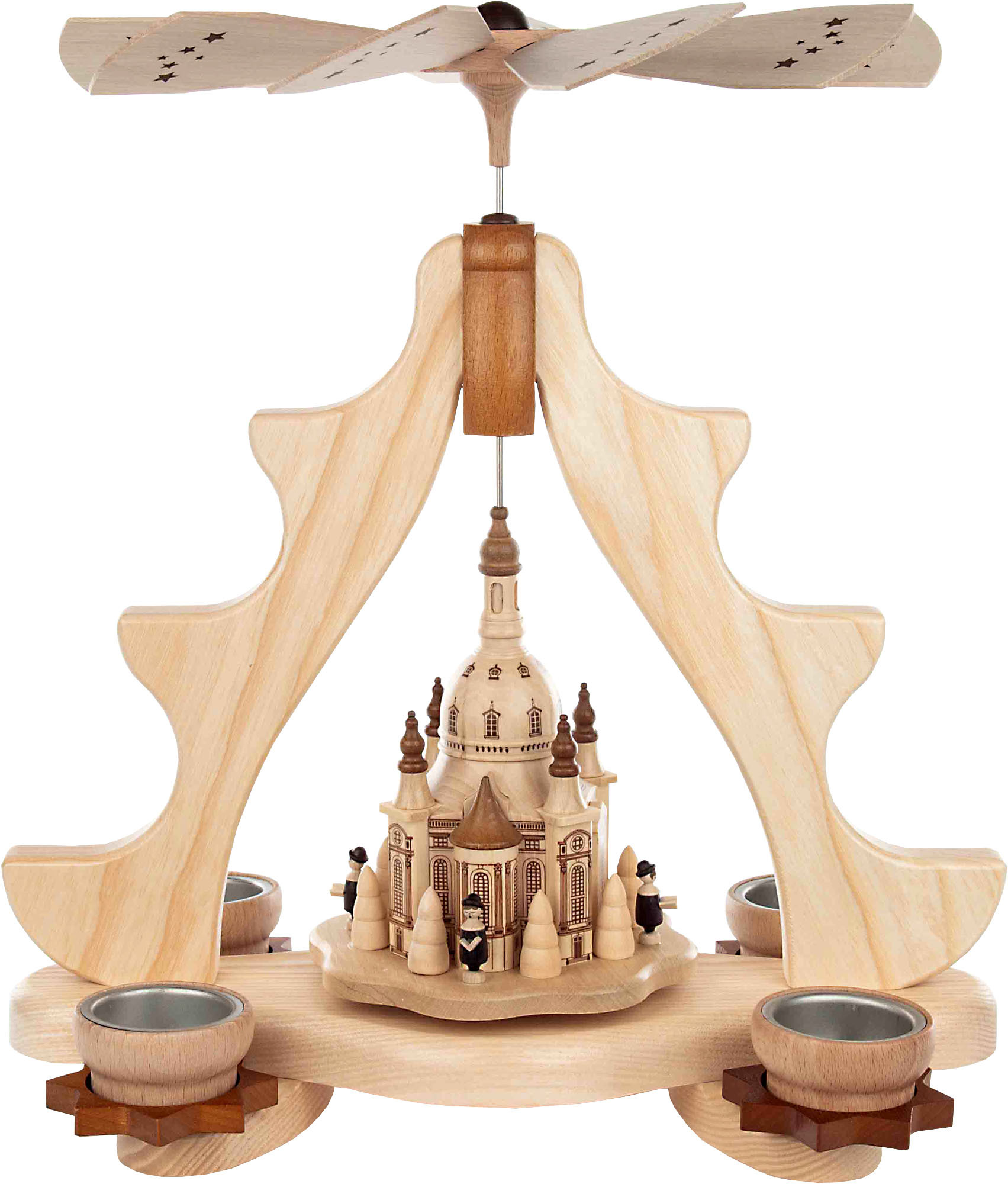Auf dem Drehteller ist die Dresdner Frauenkirche zu sehen. Um ihr herum sind Bäume zu sehen. Zwischen diesen stehen Kurrendefiguren.