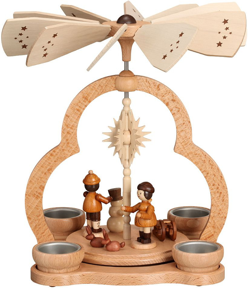 Auf dem Drehteller sieht man zwei Kinder, einen Schneemann, zwei Hasen und einen Schlitten. Am Drehstab ist die Sonne. Für diese Pyramide benötigen sie 4 Teelichter.