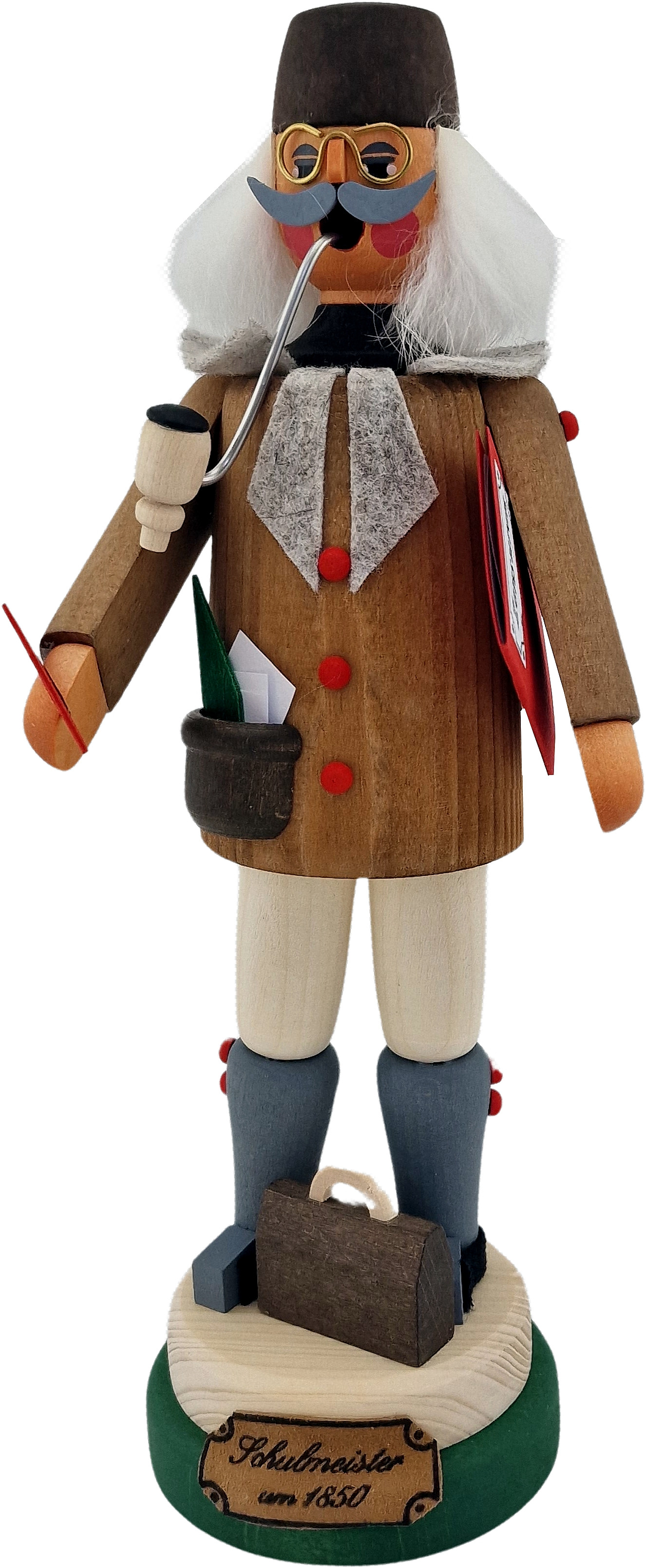 Der Lehrer hat sich unter einem Arm ein rotes Klassenbuch geklemmt. Vor sich hat er seine Aktentasche stehen. In den Pausen raucht er in aller Ruhe seine Pfeife.
