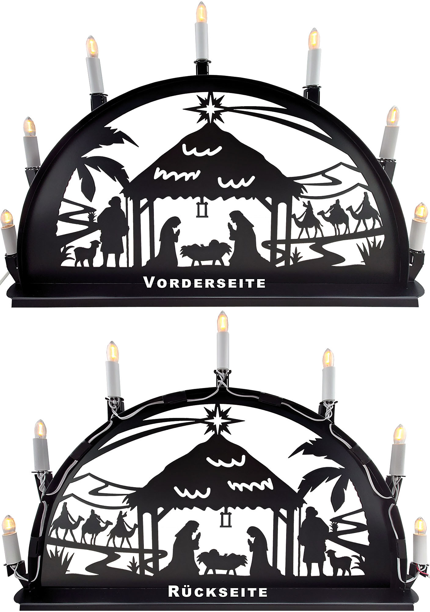 Dieser Metallschwibbogen zeigt das Motiv Christi Geburt. Es ist mit eines der beliebtesten Motive der erzgebirgischen Volkskunst. Hergestellt ist er aus Aluminium und ist pulverbeschichtet. Der Schwibbogen ist eher für Innen als für Außen geeignet.