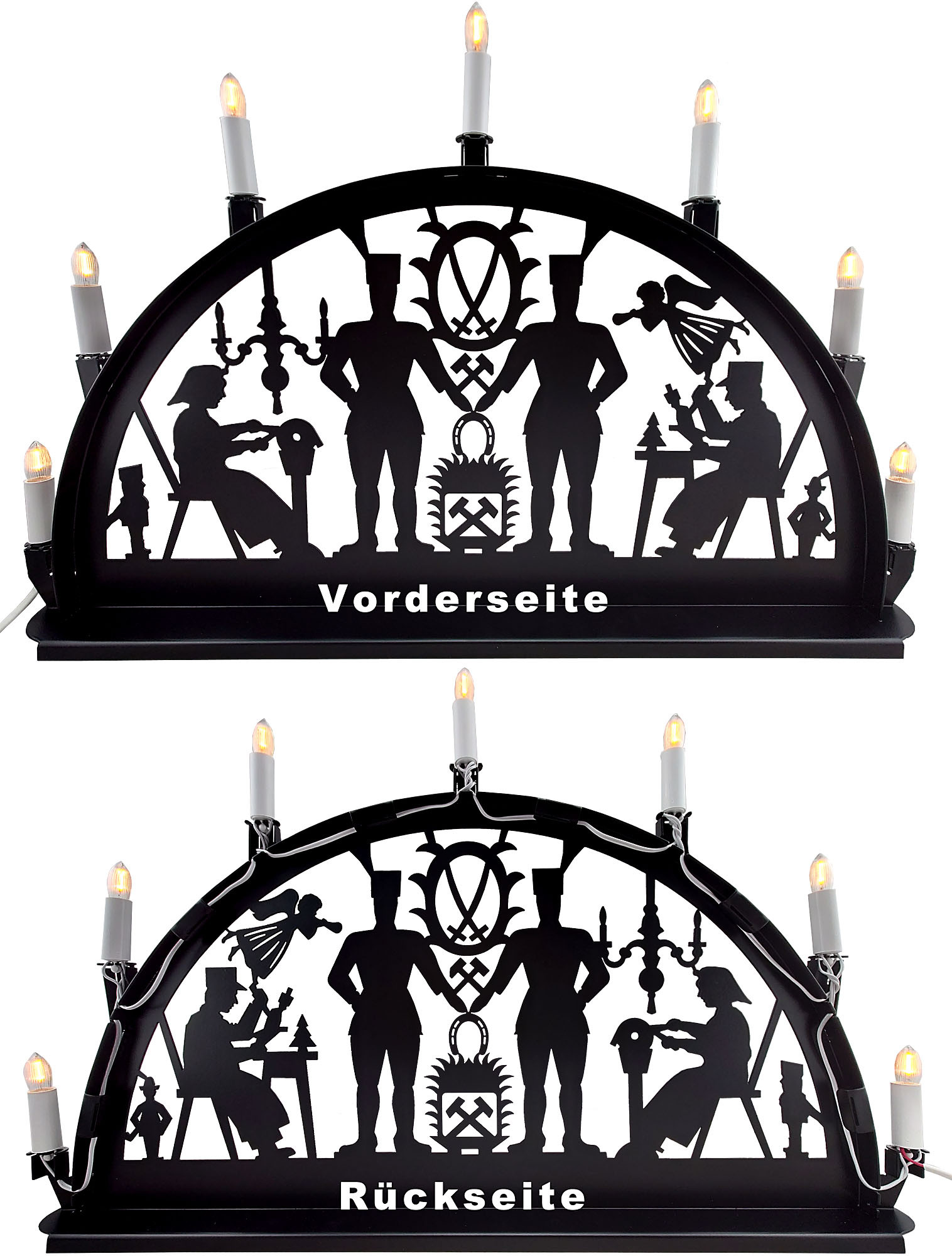 Dieser Metallschwibbogen zeigt das Motiv Schwarzenberg. Es ist mit eines der typischsten Motive der erzgebirgischen Volkskunst. Hergestellt ist er aus Aluminium und ist pulverbeschichtet. Der Schwibbogen ist eher für Innen als für Außen geeignet.
