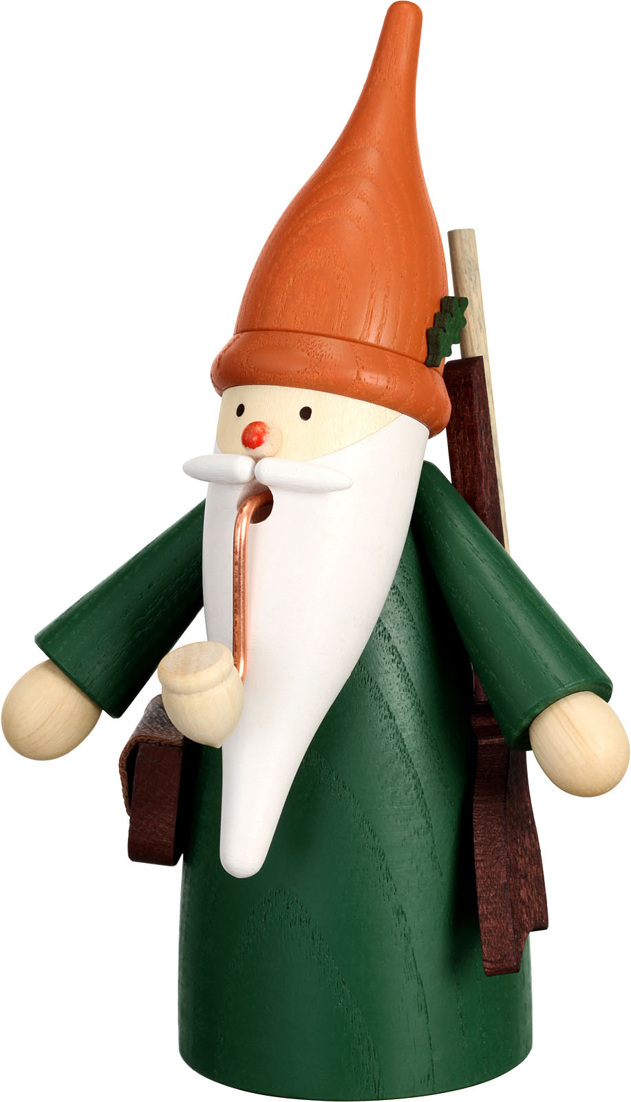 Der Jäger ist mit einem grünen Mantel und einer orangen Zipfelmütze bekleidet. Über seine Schulter hat er sich das Gewehr gehangen. An der Seite trägt es eine braune Tasche.