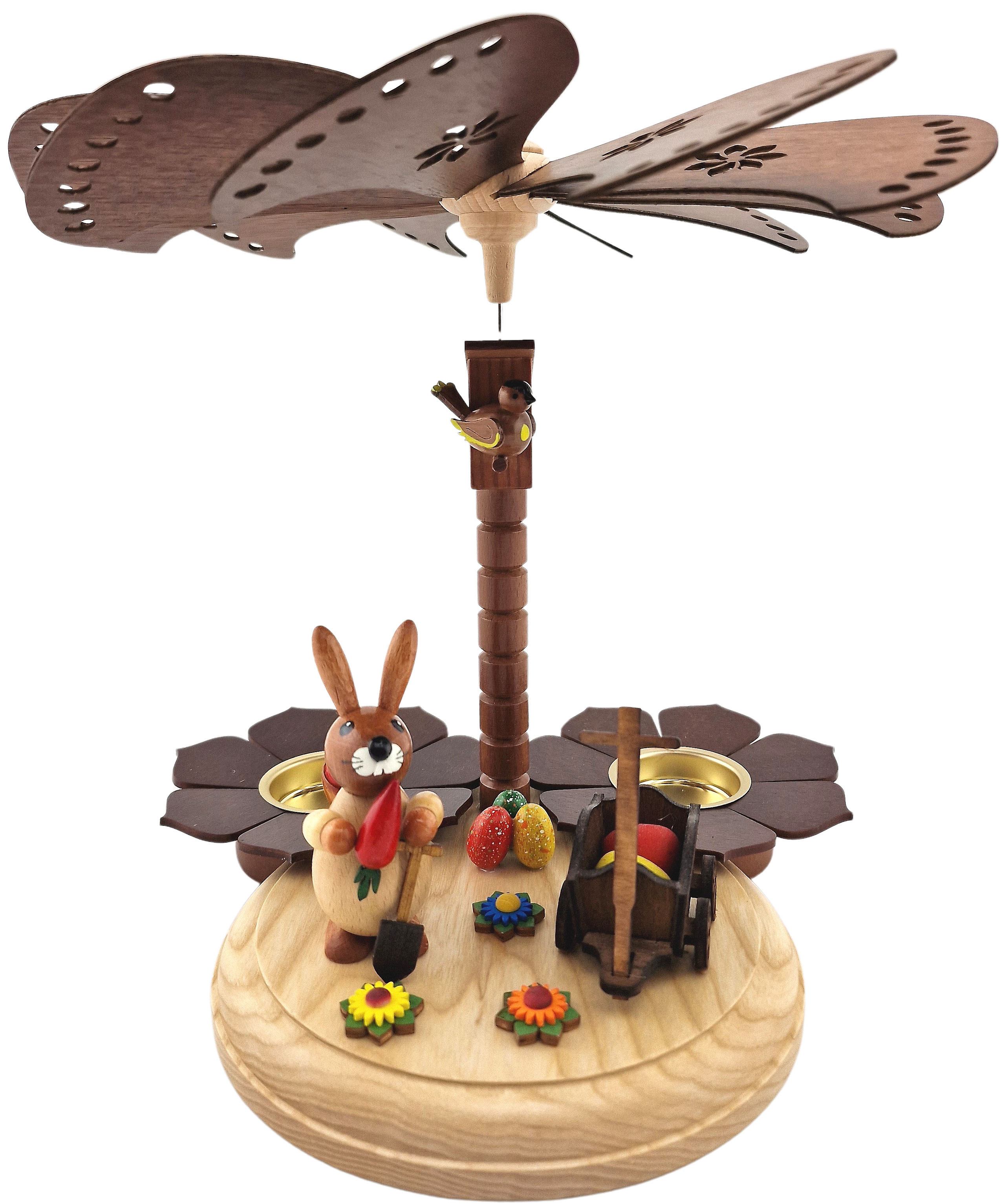 Die Kerzentüllen werden von dunklen Blütenblättern umrahmt. Vor ihnen steht ein Hase, welcher einen Korb gefüllt mit Eiern in der Hand hält. Neben ihm steht eine Schubkarre. Auch auf ihr liegen bunte Eier. Weitere bunte Eier liegen auf der anderen Seite neben der Schubkarre. Drei Blumen sind vor dem Hasen zu sehen. Der Metallstab schaut aus einem Vogelhaus, welches auf einem Holzstab sitzt, heraus. Ein Vogel sitzt auf der Stange am Vogelhaus. Aus den Pyramidenflügeln wurden Blüten und ovale Kreise ausgefräst.