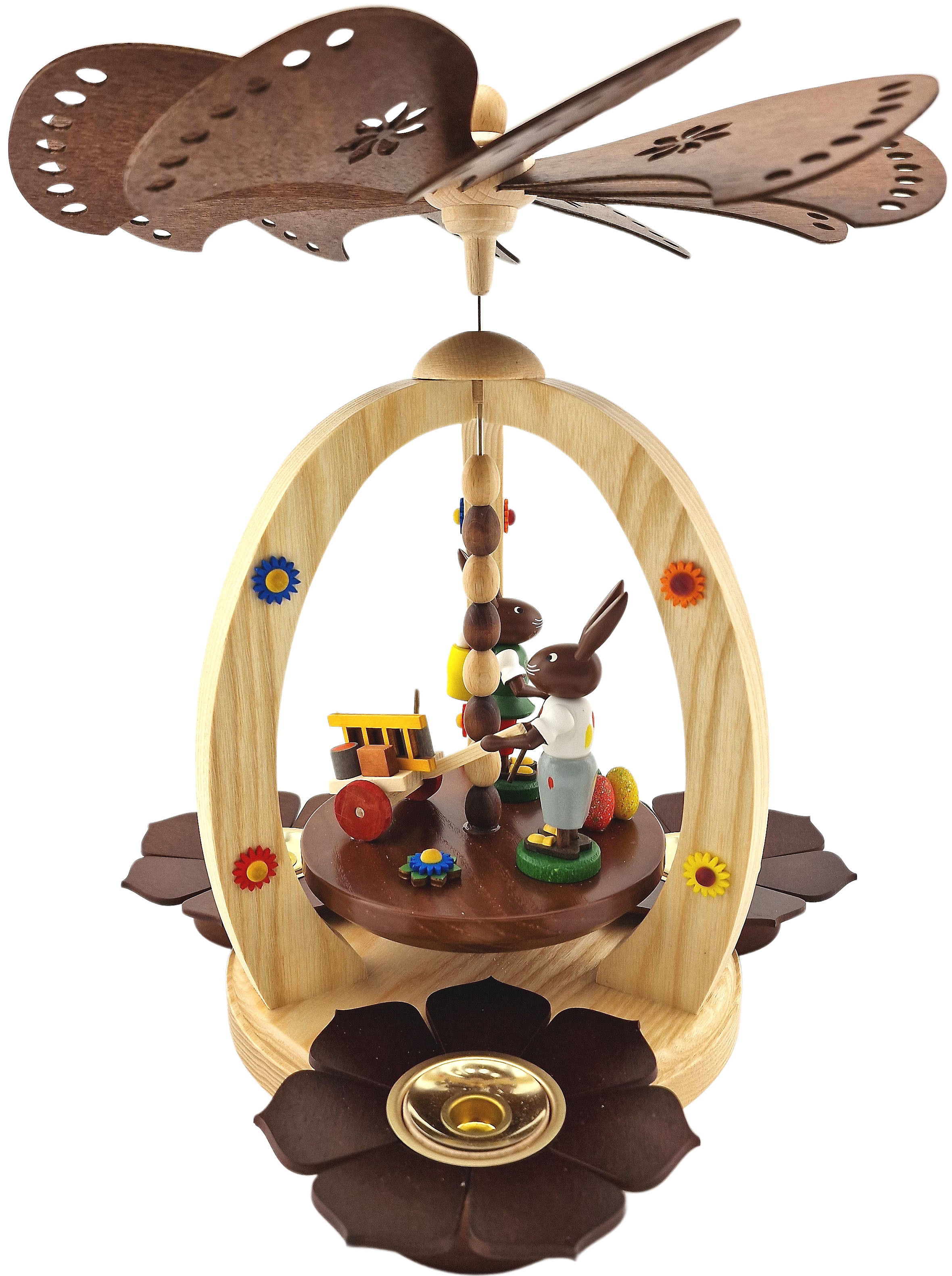 Auf den Pyramdidenbögen sind Vögel, welche auf einer Stange sitzen, zu sehen. Die Kerzenhalter sind wie Blüten gestaltet. Aus den Pyramidenflügeln wurden kleine Kreise und Sterne ausgefräst.