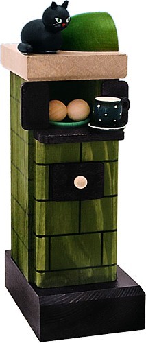 Der Kachelofen der Firma KWO ist liebevoll gestaltet. Oben auf dem Ofen sitzt eine Katze. Zum Warmhalten wurde eine Tasse und ein Teller auf die Abstellfläche gestellt. Der Rauch des Räucherkerzchen steigt aus dem Teller auf.