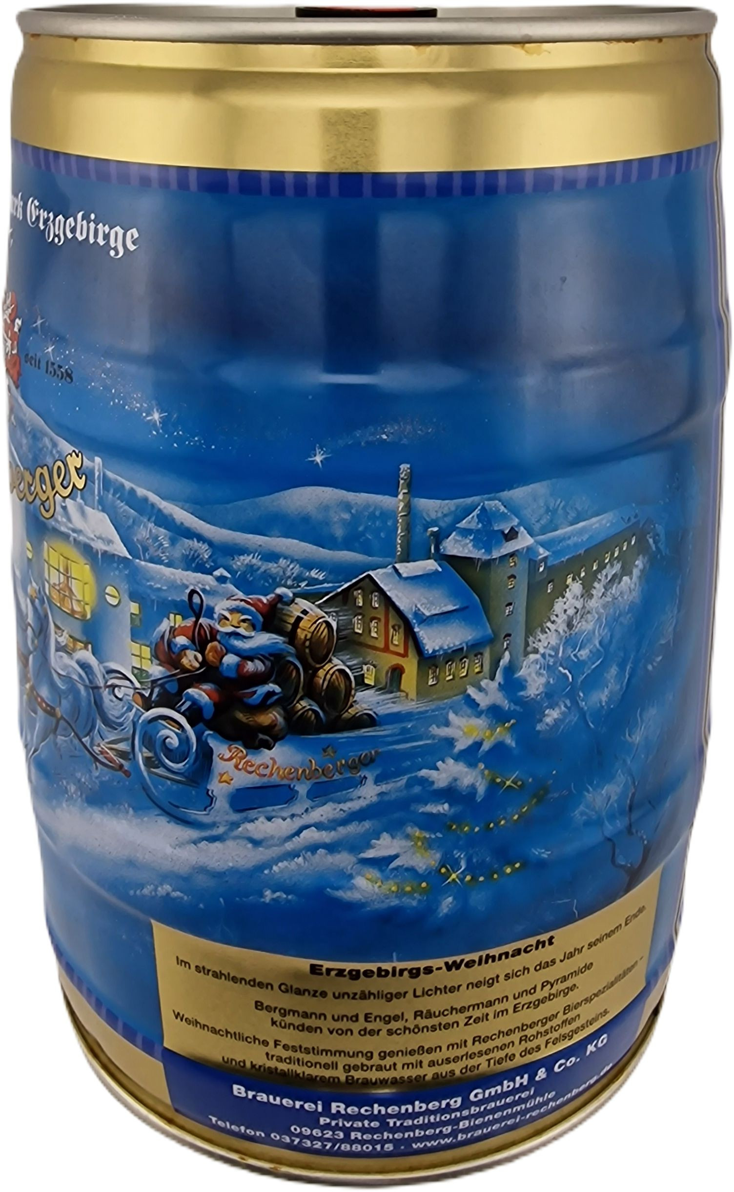 Das Deutsche Weihnachtsbier der Brauerei Rechenberg ist jedes Jahr nur im November und Dezember erhältlich. Nur solange der Vorrat reicht! Das Bierfäßchen hat einen integriertem Zapfhahn. Einfach aufdrehen und nach dem 1. Bier die Luftzufuhr oben öffnen. Auf dem Bierfässchen ist der Weihnachtsmann abgebildet, der auf einem Pferdeschlitten (vollbeladen mit Rechenberger Bierfässer) an der Rechenberger Brauerei vorbei fährt. Das linke Gebäude ist die neue Brauerei, in der das Bier gebraut wird. Das rechte Gebäude ist die Historische Brauerei, in der sich das Brauereimuseum mit Schalander gefindet.