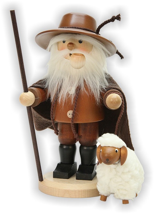 Auf einer Wiese hütet der Schäfer seine Herde und raucht dabei seine Pfeife. Ein Schaf hat sich neben ihm gestellt. Um seine Schultern hat er sich einen Umhang gebunden. Ein Hut auf seinem Kopf schützt ihn vor Wind und Wetter.