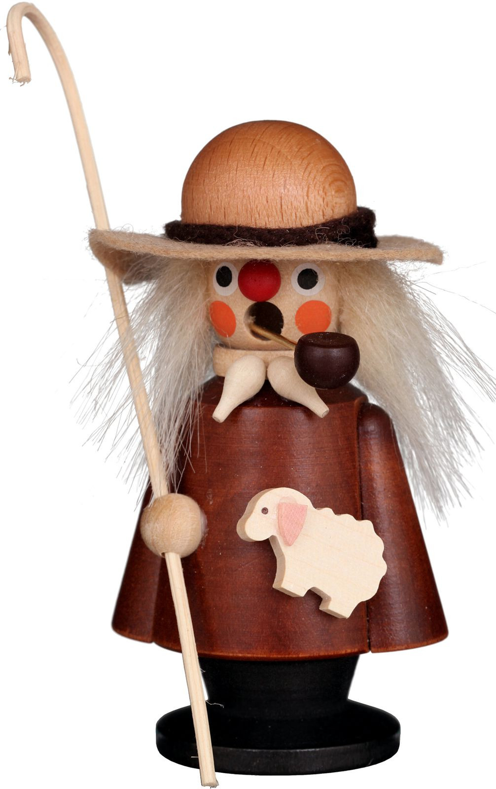 Der Schäfer hat dunkelbraune Oberbekleidung an. Auf seinem Kopf befindet sich ein brauner Hut. Im Mund steckt die Pfeife. In einer Hand hält er den Hirtenstab. In der anderen das kleine Lamm.