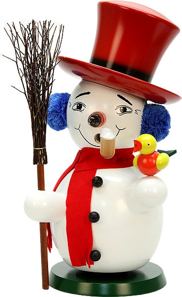 Der Räuchermann Schneemann trägt um den Hals ein rotes Halstuch und auf dem Kopf blaue Ohrenschützer sowie einen roten Zylinder. Im Mund sieht man eine Pfeife. Auf dem Bauch sind drei schwarze Kugeln zu sehen. Ein Vogel mit orangenen Bauch, gelben Flügeln, gelben Kopf und grünem Schwanz sitzt auf dem einen Arm. Im anderen Arm ist ein Besen zu sehen.