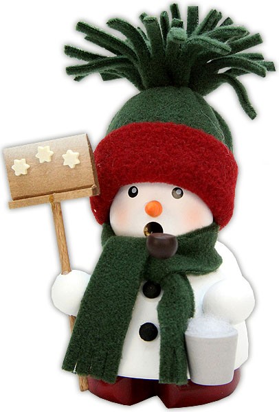 Der Schneemann ist bekleidet mit einem grünen Schal und einer grünen Mütze. Diese besitzt einen roten Rand. In einer Hand hält er einen Eimer mit Salz. Mit der anderen hält er eine Schneeschaufel fest.