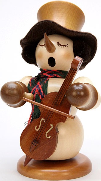 Der Räuchermann Schneemann ist ein Musiker und spielt den Bass, welchen er mit der linken Hand hält. In der rechten hat er den Bassbogen.