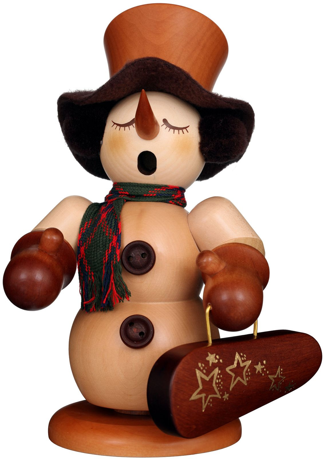 Der Schneemann trägt auf seinem Kopf einen Zylinder. Um seinen Kopf hat er sich einen Schal gebunden. In seiner Hand hält er den Geigenkasten.