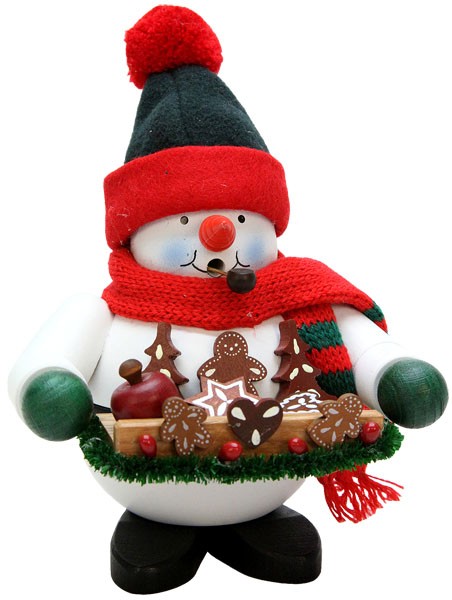 Der Schneemann trägt einen Schal, eine Mütze sowie grüne Handschuhe. Er hat sich einen Bauchladen umgehängt. Darauf sind Lebkuchen in verschiedenen Formen und ein Bratapfel zu sehen.