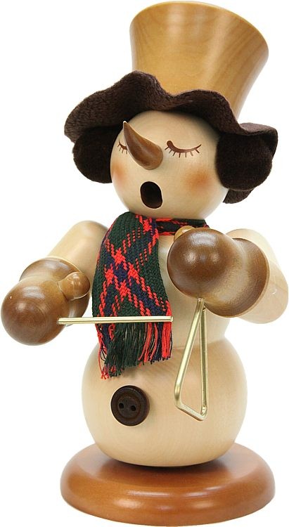 Der Schneemann trägt auf seinem Kopf einen Zylinder. Um seinen Kopf hat er sich einen Schal gebunden. In seinen Händen hält er eine Triangel.