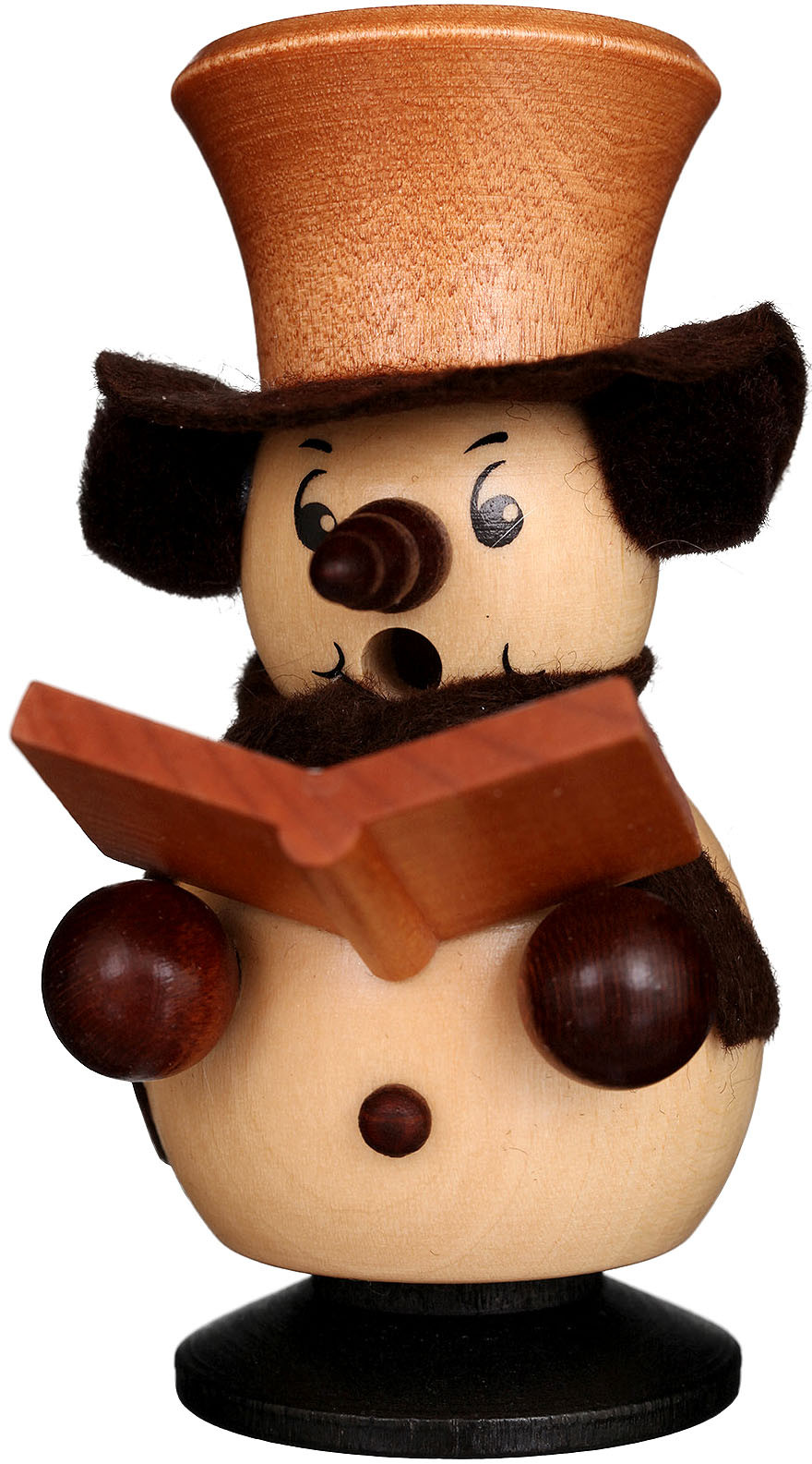 Der Schneemann trägt um seinen Hals einen Schal. Auf seinem Kopf sitzt ein Zylinder. Ohrenschützer sind unter dem Zylinder zu sehen. Er hält in seinen Händen ein Gesangsbuch und singt laut mit im Chor.