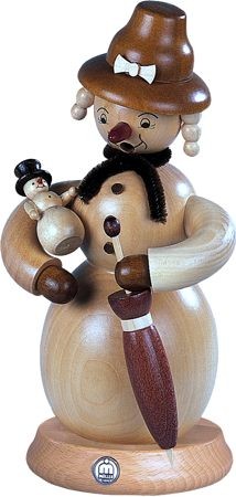 Die Schneefrau hält in ihrem Arm einen kleinen Schneemann. Sie trägt einen Hut und einen Schal. Unter dem Hut schauen Zöpfe heraus. Mit einer Hand hält sie einen Regenschirm.