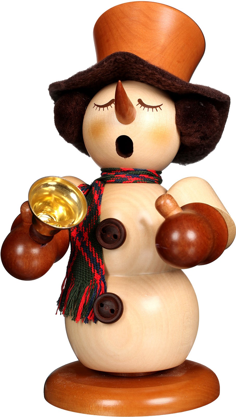 Der Schneemann hat sich einen Schal um den Hals gebunden. Auf seinem Kopf befindet sich ein Zylinder. Darunter sind braune Ohrenschützer zu sehen. Den Mund hat er geöffnet und die Augen geschlossen. In einer Hand hält er eine Glocke.