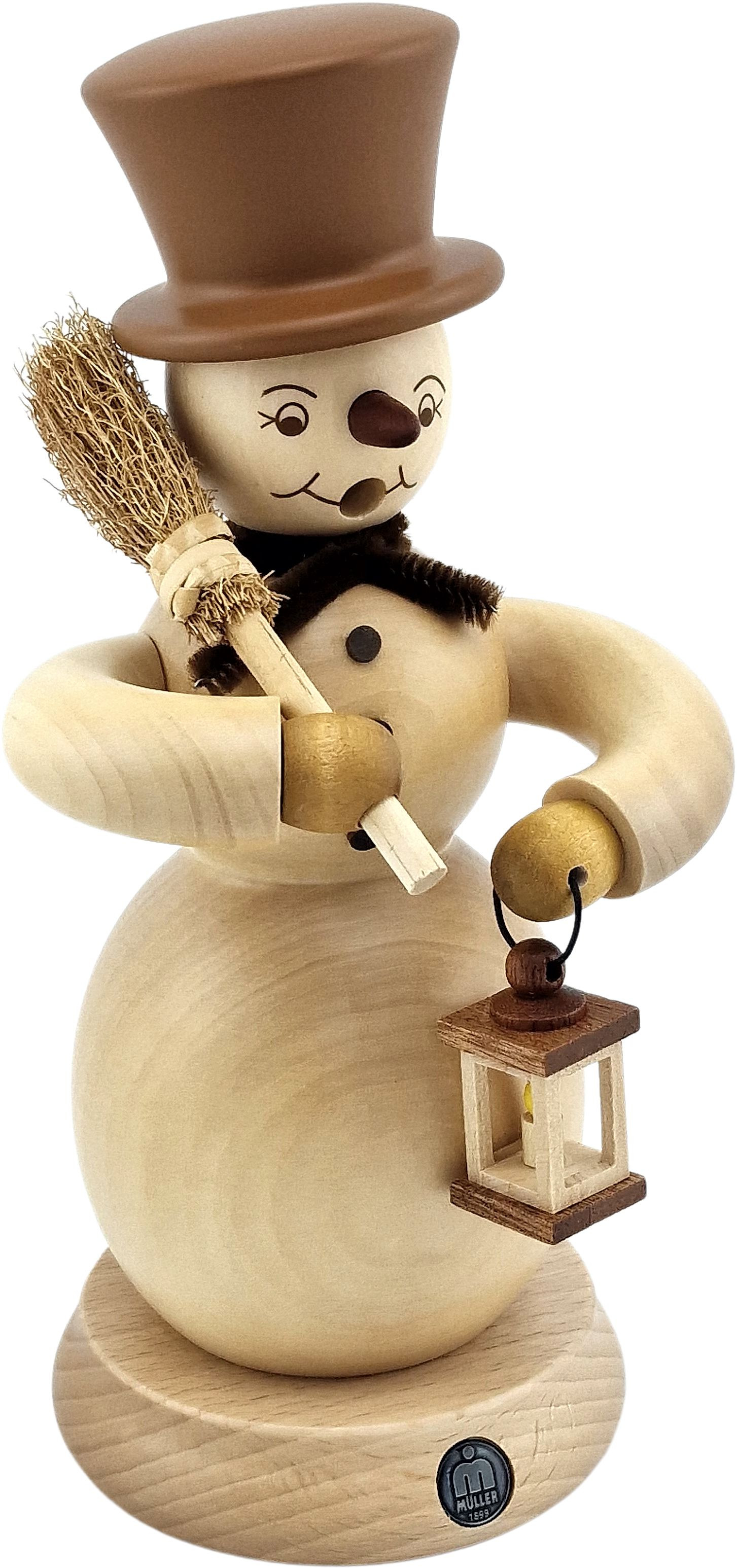 Der Schneemann hält in seinen Händen eine Laterne und einen Besen. Auf seinem Kopf sitzt ein Zylinder. Gegen die Kälte hat er sich einen Schal um den Hals gebunden.