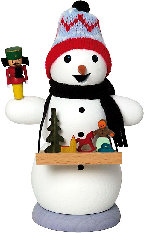 Die Kinder haben einen Schneemann gebaut und diesen wie einen Weihnachtsmarktverkäufer angezogen. Auch einen Bauchladen haben sie ihm um den Hals gehängt.