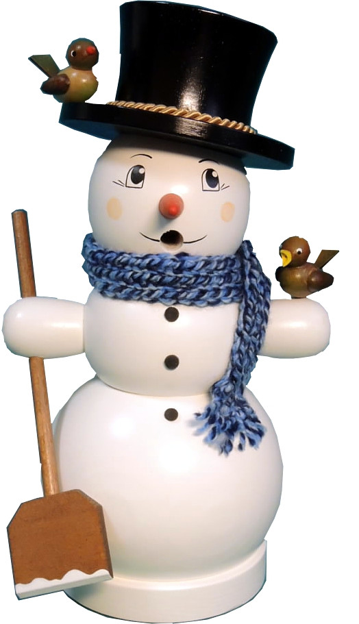 Dieser Schneemann hat auf seinem Kopf einen schwarzen Zylinder mit einer goldenen Kordel und einem kleinen Vögelchen auf. Um den Hals hat er sich einen blauen Schal gebunden. In einer hand hält er eine Schneeschaufen und auf der anderen sitzt ein Vögelchen.