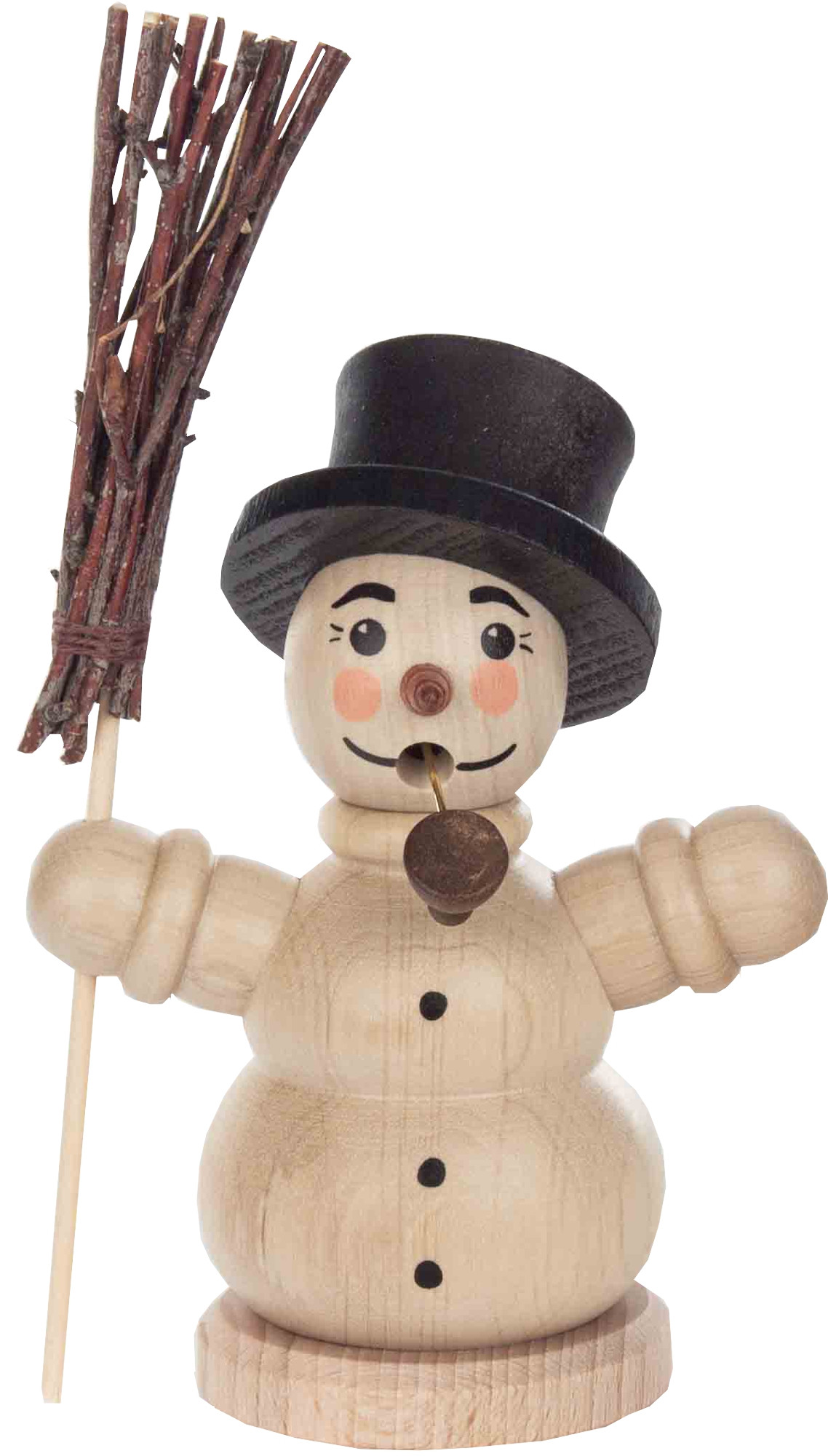 Der Schneemann trägt auf seinem Kopf einen Zylinder. Seine Pfeife steckt in seinem Mund. Er hält in einer Hand einen Besen.