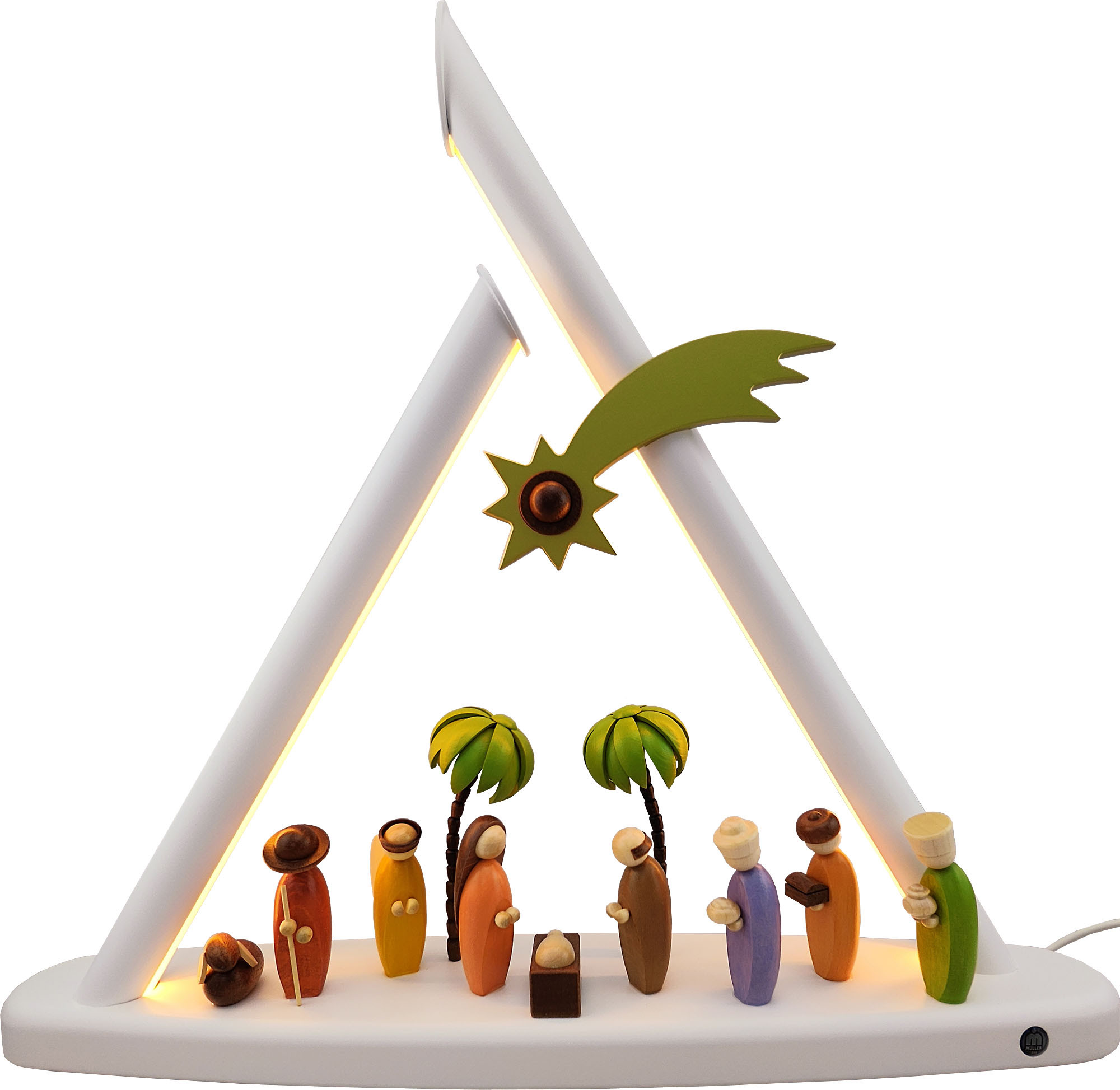 Die Spitzen dieses Lichterbogens berühren sich nicht, sondern sind offen. In den Innenseiten befindet sich ein LED-Band, wodurch die Szenerie in ein stimmungsvolles Licht getaucht wird.