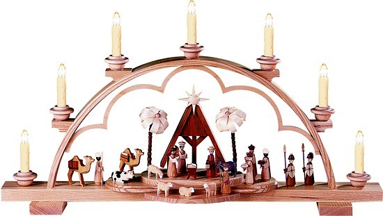 Dieser Schwibbogen zeigt die Geburt Christi auf drei Ebenen. In der Mitte auf der obersten Ebene befindet sich der Stall, an dessen Spitze der Stern von Bethlehem zu sehen ist. Maria und Joseph stehen davor an der Krippe mit dem Jesuskind. Ein Engel ist hinter Maria stehend zu sehen. Neben Joseph steht ein Esel und ein Schaf neben Maria. Umrahmt wird dies von zwei Palmen.