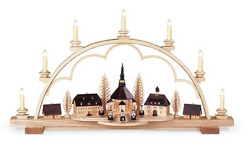 Der Schwibbogen zeigt in der Mitte die Seiffener Barockkirche. Vor ihr steht eine Kurrunde, bestehend aus 5 Figuren. Auf der einen Seite ist die Alte Schule zu sehen und auf der anderen das Rathaus mit dem Glockentürmchen. Zwei typische Häuser der früheren Bergmänner stehen an den Außenseiten. Zwischen den Häusern befinden sich Spanbäume. Über den Häusern ist am Rundbogen das typische Wolkenmotiv der Firma Kleinkunst Müller angebracht.