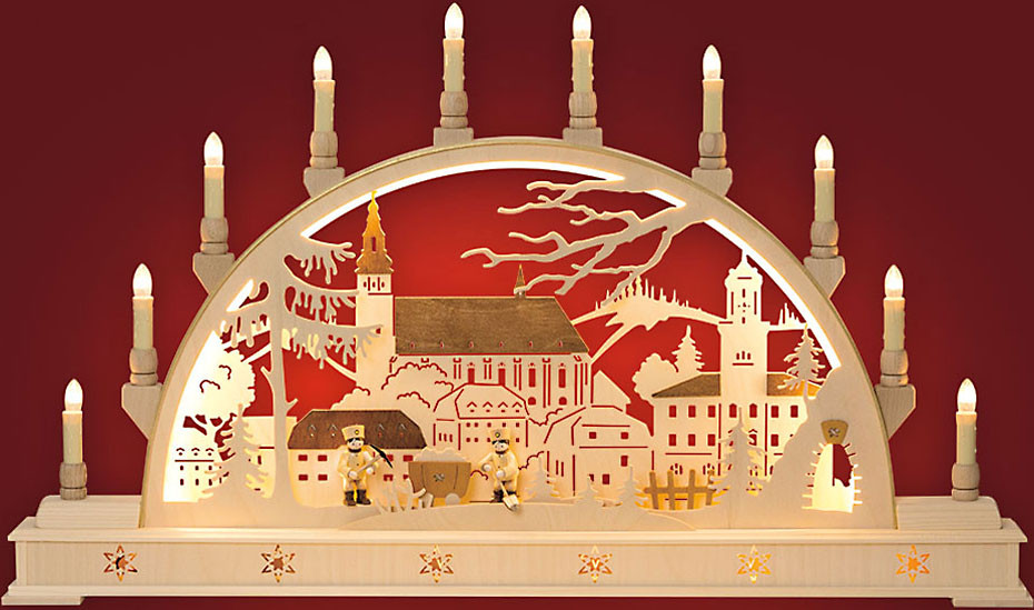 Die Szenerie der Erzgebirgslandschaft mit den beiden Bergmännern bei der Arbeit wird von einem LED-Band an der Innenseite des Rundbogens beleuchtet.
