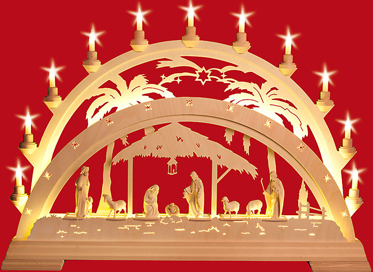 Der hintere Bogen zeigt Palmen und in der Mitte den Stern von Bethlehem. Im vorderen ist der Stall mit der Heiligen Familie und den Hirten mit Schafen zu sehen.
