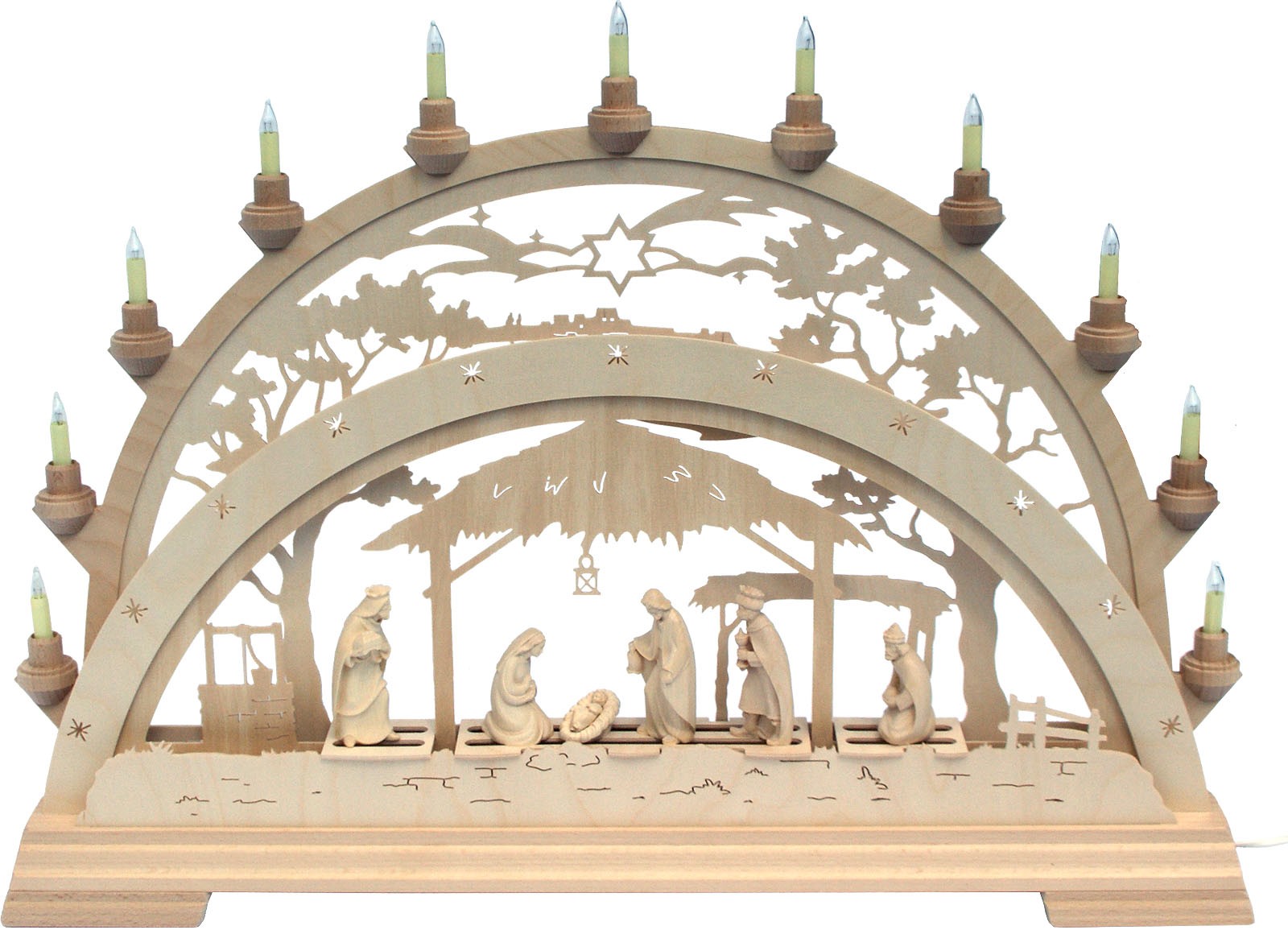 Der hintere Bogen zeigt Pinien und in der Mitte den Stern von Bethlehem. Unter diesem ist die Silhouette der Stadt erkennbar. Im vorderen ist der Stall mit der Heiligen Familie und den Heiligen Drei Könige zu sehen.