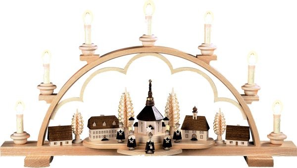 Im Mittelteil des Lichterbogens ist eine halbrunde Plattform angebracht, auf der 3 Figuren der Kurrende stehen. Eine weitere, längliche Plattform wurde über die halbrunde gesetzt. Darauf stehen die alte Schule, das Rathaus mit dem Glockentürmchen, 2 weitere Kurrendefiguren sowie 2 Spanbäume. In der Mitte befindet sich eine runde Platte, auf der die Seiffener Kirche gesetzt wurde. Weitere Spanbäume und zwei Häuser sind außen zu sehen.