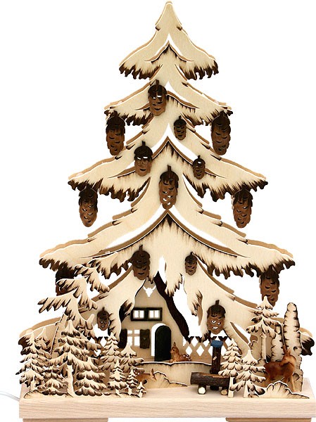 Dieser Schwibbogen wurde einer Tanne nachempfunden. An seinen Zweigen hängen Zapfen herunter. Vor ihm steht ein Haus mit einer Futtertränke. Rehe haben sich auf der Futtersuche hier eingefunden.