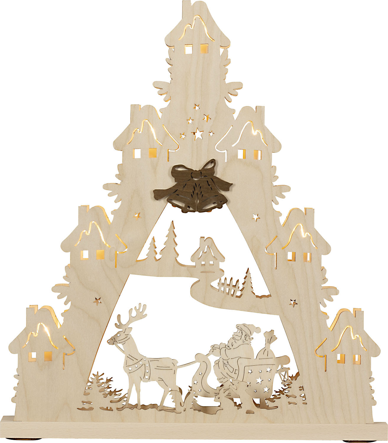 Der Weihnachtsmann fährt mit seinem Schlitten durch den Winterwald. Die Glocken in der Spitze setzten durch die Verwendung von dunklem Holz farbige Akzente.