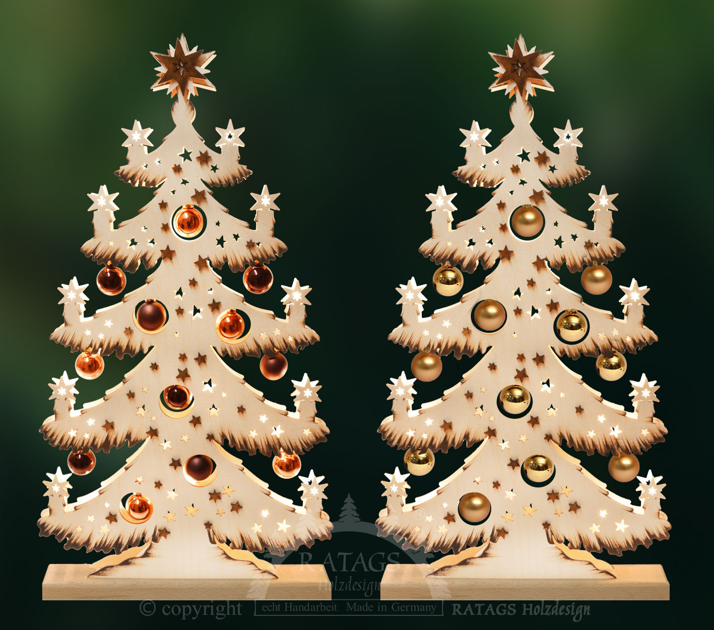 Bei diesem Artikel handelt es sich um einen 3D-Schwibbogen der Firma RATAGS. Die Kugeltannen werden mit je zwei unterschiedlichen Kugelsets in den Farben gold und kupfer geliefert. Der Schwibbogen ist von Hand bemalt, mit Rauhreif und die Äste sind an der Unterseite braun. Er verfügt über eine indirekte LED-Beleuchtung.