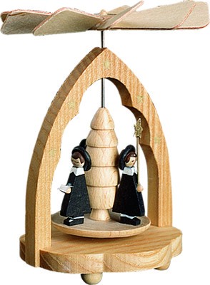 Für diese Pyramide sind keine Wachskerzen oder Teelichter oder elektrische Kerzen notwendig. Die Flügel werden durch die aufsteigende, warme Luft der Heizkörper oder eines Kachelofens angetrieben.