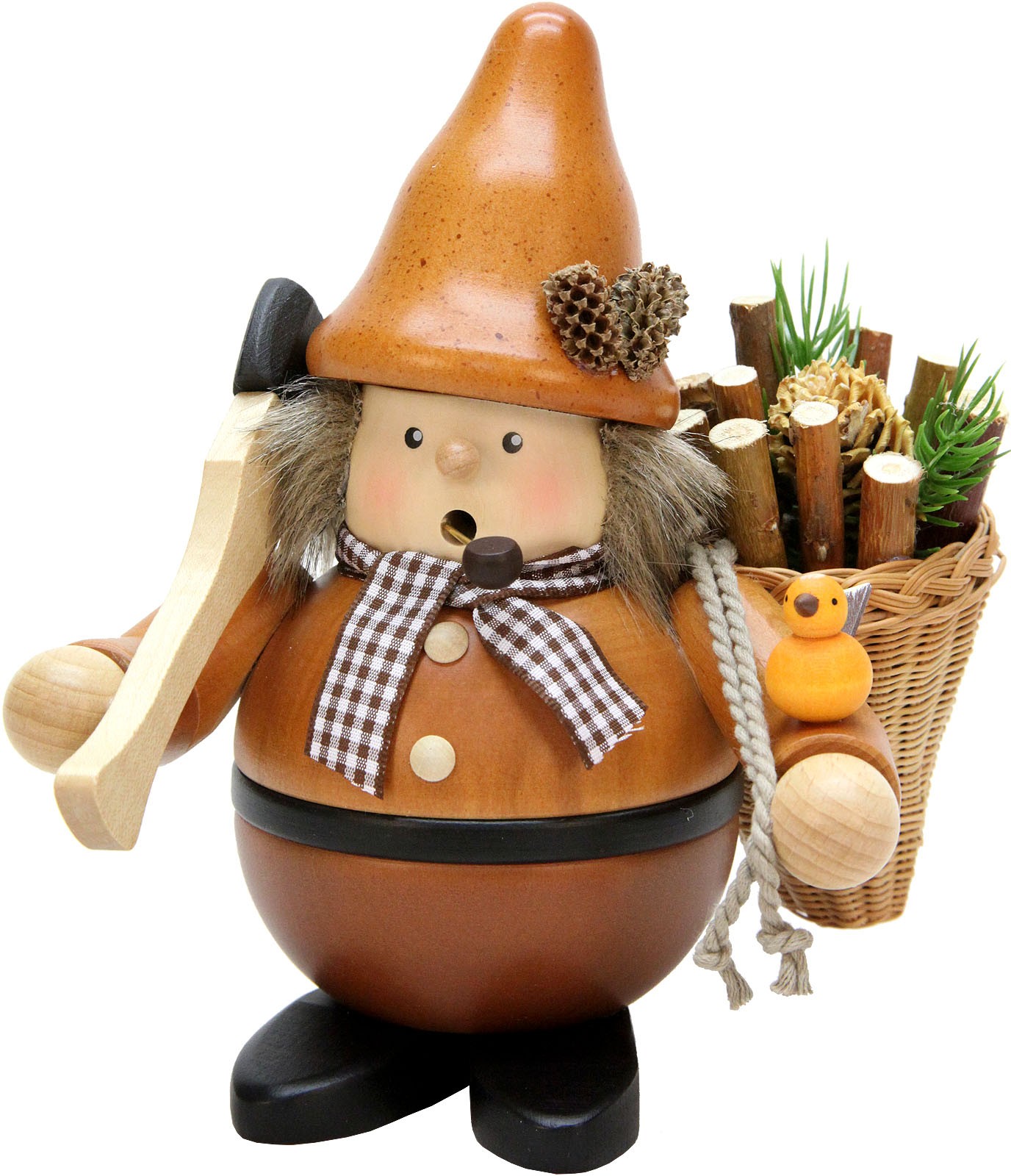 Der Holzsammler trägt auf seinem Rücken einen Korb. Dieser ist gefüllt mit Holzstücken. Seine Axt hat er sich über die Schulter gelegt. Ein kleiner Vogel hat sich auf seinem Arm niedergelassen.