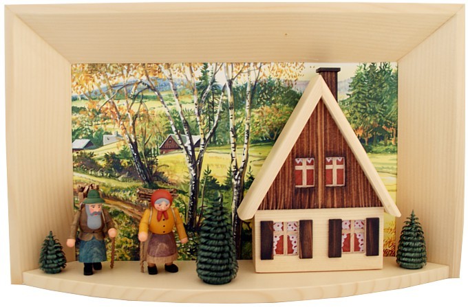 Der Mann und seine Frau kommen gerade nach Hause. Auf ihren Rücken tragen Sie Körbe beladen mit Holz und Reisig. Im Hintergrund sind Wälder, Wiesen und Häuser zu sehen.