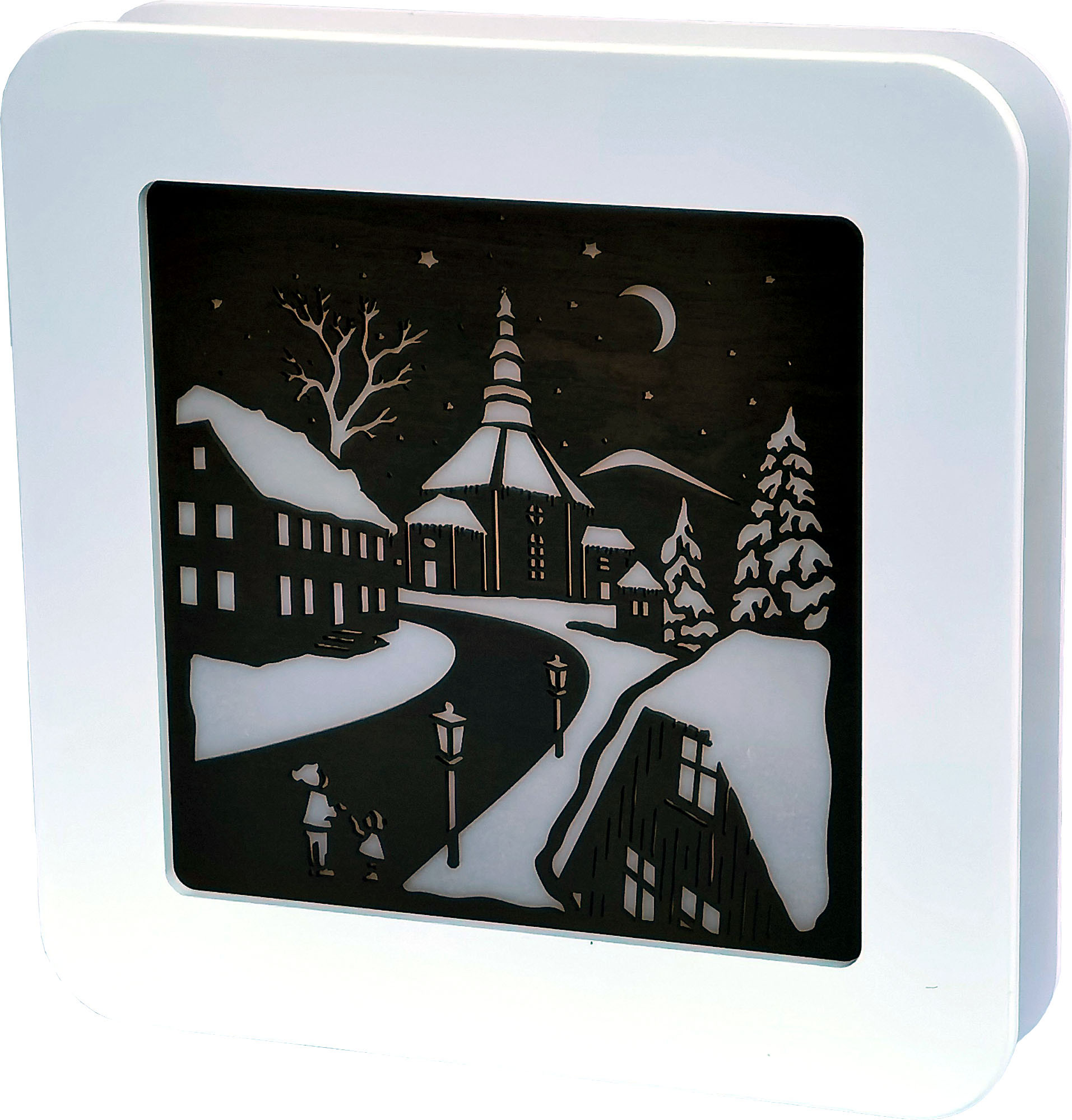 Das Motiv ist beim Standbild auf der Vorder- und Rückseite gleich. Dieses Standbild ist batteriebetrieben und mit einem LED-Strip ausgestattet.